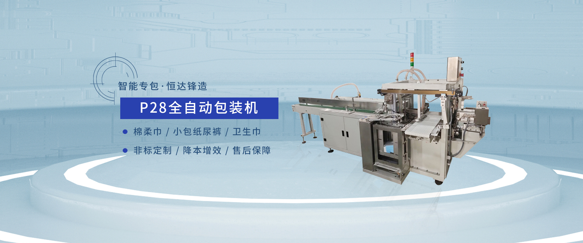 厦门恒达锋机械有限公司成立于2008年,是一家集产品研发、生产、销售、服务于一体的现代型企业。恒达锋系列产品已覆盖护理垫、卫生巾、纸尿裤、拉拉裤、宠物垫等后道全自动包装及半自动包装等整体解决方案,产品并逐渐延伸至医疗、化妆品、食品等包装装备领域。